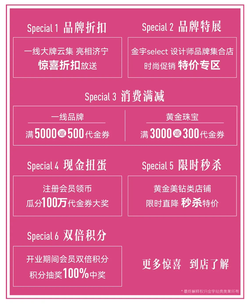 隨著金宇經(jīng)典奧萊的開業(yè),濟(jì)寧國際生活節(jié)正式拉開序幕。以回饋濟(jì)寧人為目的,制造濟(jì)寧人自己的時(shí)尚地盤,4.29-5.30盛惠不止狂歡不停,覆蓋五一黃金周,推出大量優(yōu)惠活動(dòng),時(shí)尚秀場、live演出、驚喜折扣、雙倍積分、現(xiàn)金扭蛋等,回饋廣大市民朋友!