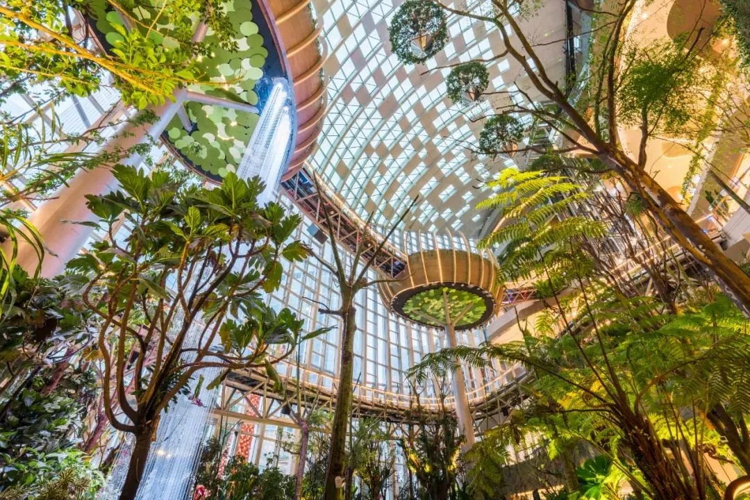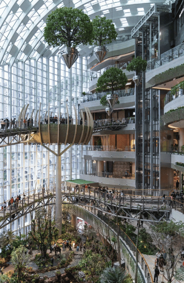 其中,「沐光森林」作為光環(huán)的標(biāo)志性景觀,以其縱跨6層、高達(dá)42米的室內(nèi)立體垂直植物園之姿,成為了眾人矚目的焦點(diǎn)。懸空其間的步行棧道,如同穿梭于綠色世界的秘徑,讓顧客在享受購(gòu)物樂趣的同時(shí),也能感受到大自然的呼吸。這條懸空跨層步道,不僅巧妙地連接了商業(yè)區(qū)域與森林景觀,更讓每一次購(gòu)物之旅都充滿了探索自然與發(fā)現(xiàn)驚喜的奇妙體驗(yàn)。