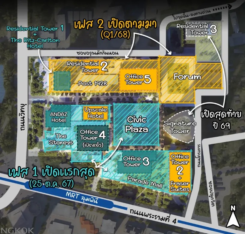 辦公樓方面,現(xiàn)階段3號塔、4號塔和5號塔已經(jīng)陸續(xù)投入使用,包括律師事務(wù)所Baker & McKenzie Ltd.、雅詩蘭黛集團、寶馬集團、KGI Securities、Menarini、LINE MAN Wongnai等跨國公司都已選擇將辦公地點遷至于此。