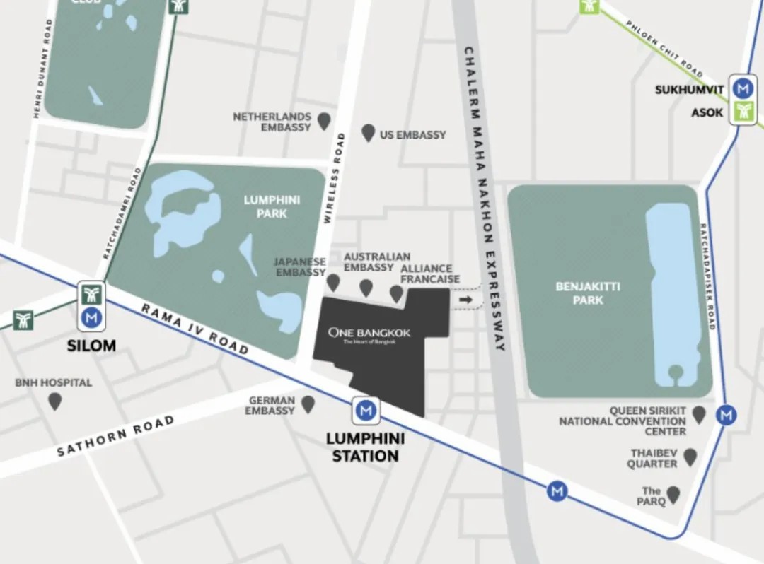 Wireless Road 和 Rama IV 路的拐角處,是曼谷市中心熱點區(qū)域的最后一塊土地,將Sathorn、Silom 和 Samyan等主要商圈連通起來,緊靠地鐵LUMPHINI站與輕軌 Ploenchit 站(在該站設(shè)有免費穿梭巴士),可完美融入周邊相對成熟的公共交通系統(tǒng)中。