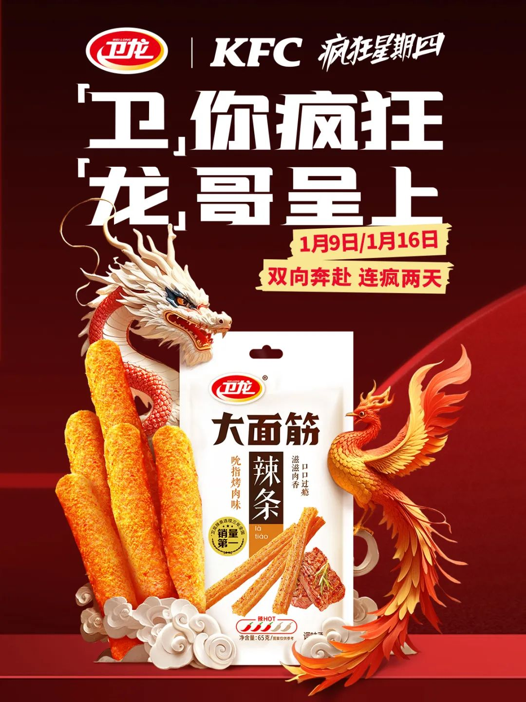 隨著2025年的到來,衛(wèi)龍攜手肯德基推出了“瘋狂星期四”活動,給營銷界帶來了一次不小的沖擊。此次衛(wèi)龍與肯德基的聯(lián)名合作,更是將“瘋狂”的概念發(fā)揮到了極致。在聯(lián)名主題店內,墻壁上布滿了以“瘋狂星期四”為主題的創(chuàng)意文案,例如“瘋搭子上線,開年就瘋辣!”和“衛(wèi)你瘋狂,龍哥呈上”等,打響2025年發(fā)瘋營銷第一炮。