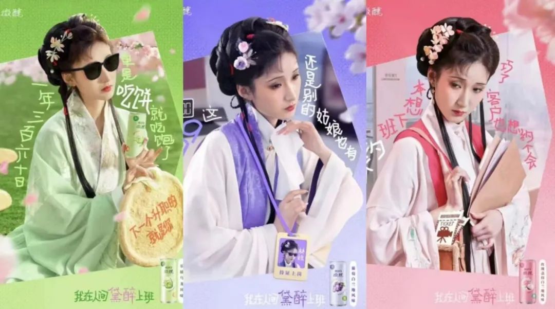 比如在五一調休這個社會熱點話題中,RIO雞尾酒請出了大IP林黛玉,推出一組“我在人間黛醉上班”的海報,每一句都非常“有那味兒”。這組海報以林黛玉的形象為核心,將她的古典韻味與現代職場生活巧妙融合,每一幅都充滿了獨特的韻味與深意。