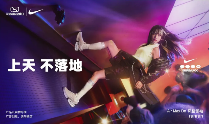 提及“發(fā)瘋”,耐克的「上天不落地」營銷大事件也是不得不提一提的。借助新發(fā)布系列的契機,耐克與天貓超級品牌日牽手,通過與潮流人群共創(chuàng),借助城市文化加強對潮流藝術的表達,深度溝通年輕人群,在社交平臺上號召網友們玩轉“先瘋”穿搭共創(chuàng)。