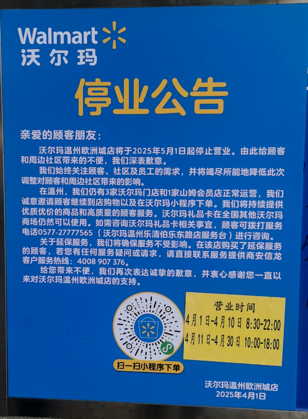 行至2025年,除了如胖東來、山姆等商超企業(yè),超市行業(yè)的生意依然難做。4月1日,沃爾瑪溫州市區(qū)最后一家門店宣布將于5月1日停業(yè),該店是繼沃爾瑪東海店、沃爾瑪鴻瑛店之后,溫州市區(qū)營業(yè)的唯一一家實體店。在關閉門店的公告中,沃爾瑪明確表示,關店原因主要歸結(jié)為戰(zhàn)略調(diào)整以及合同或租約到期。其中廣州新港店,由于所在商城整體改造升級,預計今年10月將重新開業(yè)。