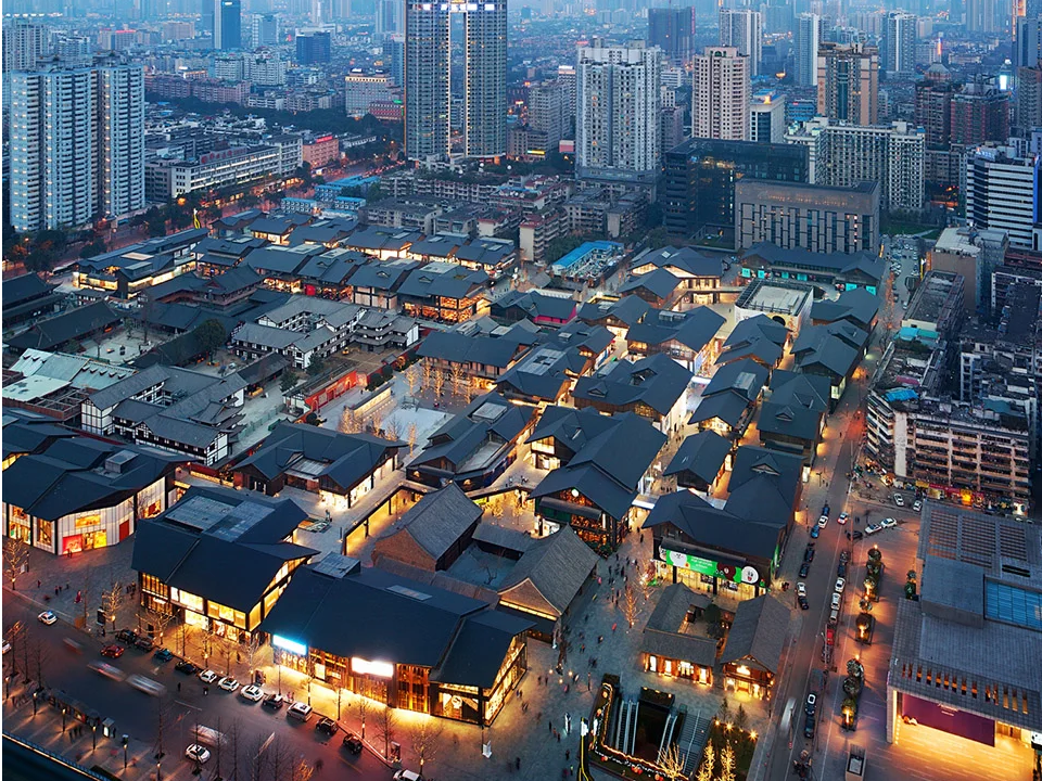 正如隈研吾所言:“在地性不是對(duì)傳統(tǒng)的復(fù)制,而是讓建筑成為土地呼吸的器官”。成都遠(yuǎn)洋太古里不僅完整保留了大慈寺片區(qū)6條歷史街巷(如筆帖式街、惜字塔巷等),還修復(fù)了廣東會(huì)館、欣廬等6座川西古建筑,通過“修舊如舊”手法重現(xiàn)“解玉溪”水系景觀,形成“一寺一城”的時(shí)空對(duì)話。建筑外立面采用川西青瓦坡屋頂與現(xiàn)代玻璃幕墻結(jié)合,檐口高度與街道寬度比例嚴(yán)格控制在1:1,營(yíng)造“街巷有度”的步行體驗(yàn)。