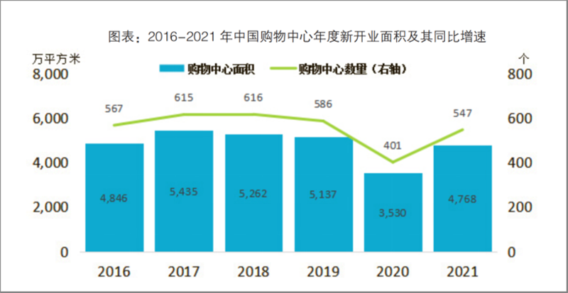 《白皮書》在“2021年中國零售市場最新發(fā)展”部分指出,2021年,中國實(shí)現(xiàn)GDP(國內(nèi)生產(chǎn)總值)114.4萬億元,穩(wěn)居全球第二大經(jīng)濟(jì)體,全年社會(huì)消費(fèi)品零售總額達(dá)到44.1萬億元,同比增長12.5%。同時(shí),中國在運(yùn)營購物中心數(shù)量達(dá)到6387個(gè),總面積達(dá)到4.75億平方米。其中,2021年新開業(yè)購物中心數(shù)量為547個(gè),總面積為4768萬平方米。中國“購物中心年新開業(yè)面積/在運(yùn)營面積”比例持續(xù)下降,2021年年末降至0.1。中國已經(jīng)進(jìn)入購物中心存量時(shí)代。